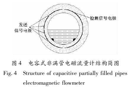 ?、陔娙菔椒菨M管電磁流量計h。電容式非滿管電磁流量計結構簡圖如圖4所示。、檢測信號電極 發(fā)送信號電