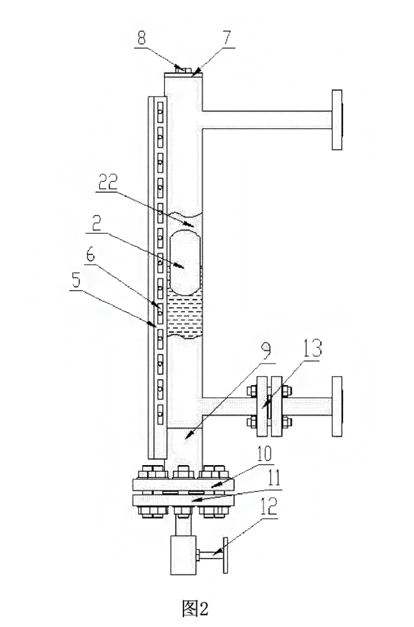 為解決上述技術(shù)問題,包括液位計(jì)主體和磁浮球,液位計(jì)主體為內(nèi)部設(shè)有磁浮球通道的圓柱體,磁浮球安裝在液位計(jì)主體的磁浮球通道內(nèi),液位計(jì)主體上通過卡箍固定安裝有顯示面板,顯示面板上設(shè)有顯示刻度,顯示面板中間開設(shè)有安裝顯示槽,安裝顯示槽內(nèi)安裝有機(jī)玻璃管,有機(jī)玻璃管內(nèi)安裝有若干個(gè)磁翻板,磁翻板表面貼有熒光片,液位計(jì)主體頂部設(shè)有上封頭,上封頭上安裝有用于放氣的上螺栓,液位計(jì)主體底部安裝有氣泡消除器,氣泡消除器下側(cè)固定安裝有連接法蘭,連接法蘭通過緊固螺栓固定安裝有排污法蘭,排污法蘭下側(cè)固定連接有排污閥門,液位計(jì)主體的一側(cè)安裝有兩個(gè)過程法蘭。