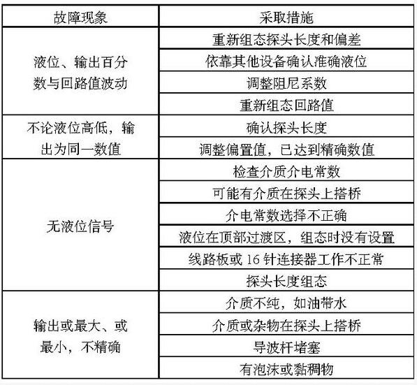 故障表現(xiàn)為液位變化而測量值恒為常數(shù), 當儲罐排空或?qū)M時儀表保持一個明顯的假料位, 也或者表現(xiàn)為槽罐內(nèi)物料將滿時顯示彈回一個低值。造成這類故障的通常是以下原因:①天線結(jié)疤。厚而濕的結(jié)疤會對微波產(chǎn)生強烈的反射, 使儀表測量值保持一個恒定的高液位值。②物料排空時天線或附近的凝聚物產(chǎn)生干擾回波。③物料排空時, 槽罐內(nèi)固定組件引起強烈回波。
