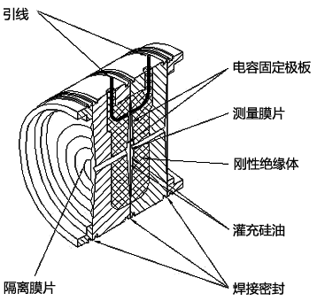 從圖2、圖3可以看出金屬電容式是兩邊受壓,壓力經(jīng)隔離膜片傳遞到內(nèi)部中心膜片上。