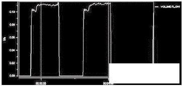 灌裝頭的終出口部分為10~14mm的可更換縮口。通過縮口,可以產(chǎn)生背壓,一般縮口內(nèi)置蜂窩狀虹吸管,保證灌裝前后的管道滿管。從測試的流量波形上看,10mm的灌裝頭產(chǎn)生適當?shù)淖枘嵝Ч?,流量曲線較穩(wěn)定。