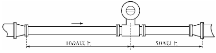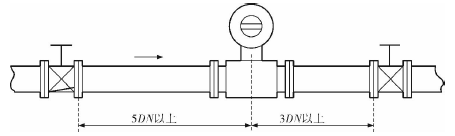 電磁流量計(jì)的安裝質(zhì)量對(duì)其測(cè)量結(jié)果的影響較大,因此在安裝時(shí)需要注意幾個(gè)問(wèn)題。*先,電磁流量計(jì)直管段的選擇在配管時(shí)一定要按照要求進(jìn)行選擇,一般選擇流量計(jì)通徑與工藝管道通徑相同,即可滿足工程需要,而且安裝方便、壓力損失小,流量計(jì)直管段上游側(cè)的長(zhǎng)度不少于5倍工藝管道直徑,下游側(cè)的長(zhǎng)度不少于3倍工藝管道直徑(圖2)。但在流速太慢而又要求精度較高或需要變徑的應(yīng)用場(chǎng)合,可選擇通徑小于工藝管道通徑的流量計(jì),以提高測(cè)量精度,此時(shí)流量計(jì)上、下游必須加裝異徑管,且進(jìn)口異徑管上游側(cè)應(yīng)有長(zhǎng)于10倍工藝管道直徑的直管段,下游側(cè)應(yīng)有長(zhǎng)于5倍工藝管道直徑的直管段(圖3)。