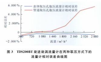 例, 系統(tǒng)運行時間為 6 0s , 標(biāo)準(zhǔn)裝置的滯止平均溫度為2 9. 7℃ , 空間平均濕度為 4 2% , 流量計的平均溫度為2 9. 3℃ , 在表體取壓孔取壓和管道取壓孔取壓的流量計檢定試驗數(shù)據(jù)分別如表 3 、 4 所示。兩種取壓方式下的流量計相對誤差曲線如圖3所示。