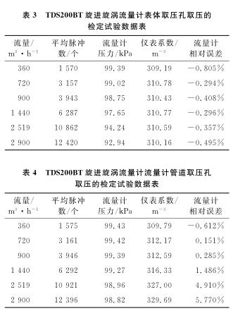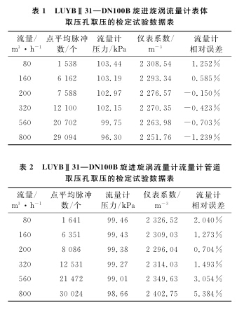 以使用**的D N 1 0 0 B天然氣流量計為例, 系統(tǒng)運行時間為6 0s , 標(biāo)準(zhǔn)裝置的滯止平均溫度為 2 8. 9℃ , 空間平均濕度為 3 0% , 流量計的平均溫度為 2 8. 3℃ , 在表體取壓孔取壓和管道取壓孔取壓的流量計檢定試驗數(shù)據(jù)分別如表 1 、 2 所示。