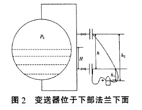 變送器位于下部法蘭下面.和圖1一樣使用常用的高壓側(cè)接下面、負壓側(cè)接上面的引壓方式,變送器的布置和常規(guī)電廠高加液位測量以及常見密閉容器測量液位一樣.如圖2所示 這種安裝方式一般需要把變送器布置于容器所在平臺的下一層變送器正壓側(cè)所受的壓力為: