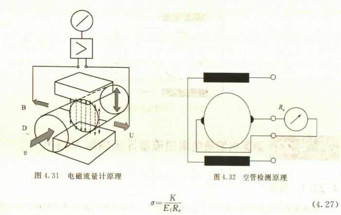 電磁流量計是專為測量導(dǎo)電液體的體積流量而設(shè)計的。測量原理是基于法拉第電磁感應(yīng)定律。按照該定律,導(dǎo)電流體通過磁場作切割磁力線運動時,在垂直于磁場及流速的方向上產(chǎn)生感應(yīng)電動勢,此電動勢由4.14節(jié)中的式4.24)給出。其原理如圖4.31所示。