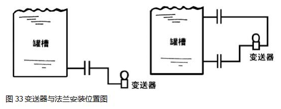 差壓式液位變送器安裝在流程接頭的上方則需要零位負(fù)遷移,。法蘭式液位變送器的安裝與使用見圖35。