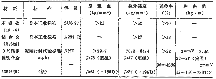 金屬材料在極低溫下的屈服點、拉伸強度、延伸率、節(jié)流、沖擊試驗值等機械性質(zhì)與常溫下有很大不同,在極低溫下,金屬材料的拉伸強度上升,但延展性降低,沖擊值也隨材料而顯著下降。因此,在極低溫下所使用的儀器的材料,應是有充分抗破壞韌性的材料,使之不引起脆性破壞,這些材料就叫做低溫材料。但是,現(xiàn)在使用的一般的材料有:不銹鋼、鋁合金、90%的鎳鋼、35%的鎳鋼(鎳鐵合金)。表3示出了低溫材料的機械性質(zhì)。圖3還示出了不銹鋼的恰貝遷移溫度曲線。