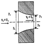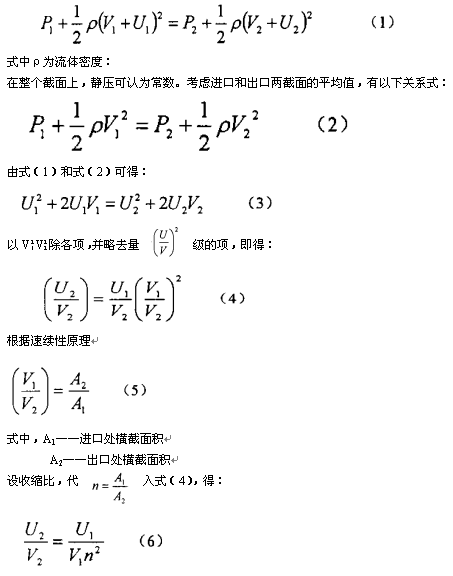 設(shè)整流器進(jìn)口處壓力為P1,平均流速為V1,某點(diǎn)上的速度不均勻度為U1,出口處壓力為P2,平均流速為V2,通過進(jìn)口處某點(diǎn)同一流線,在出口處的速度不均勻度為U2,沿該流線,由伯努利方程得: |