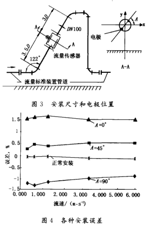 1)在本試驗(yàn)安裝條件下,流量傳感器電極軸在A一90。位置時(shí)大誤差為一1.2,A一0。位置時(shí)為+1.6,A一45。位置時(shí)為0.5;與正常安裝條